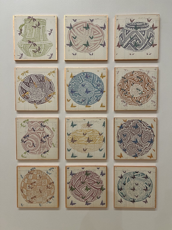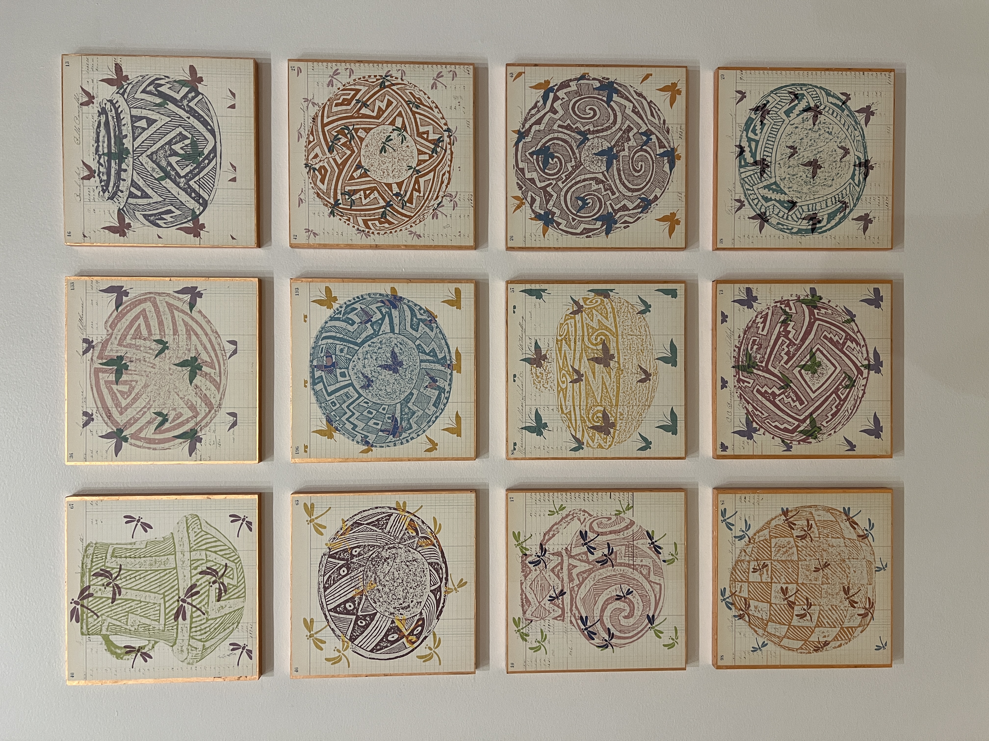 twelve digital prints on antique ledger paper, copper leaf, and birch panels