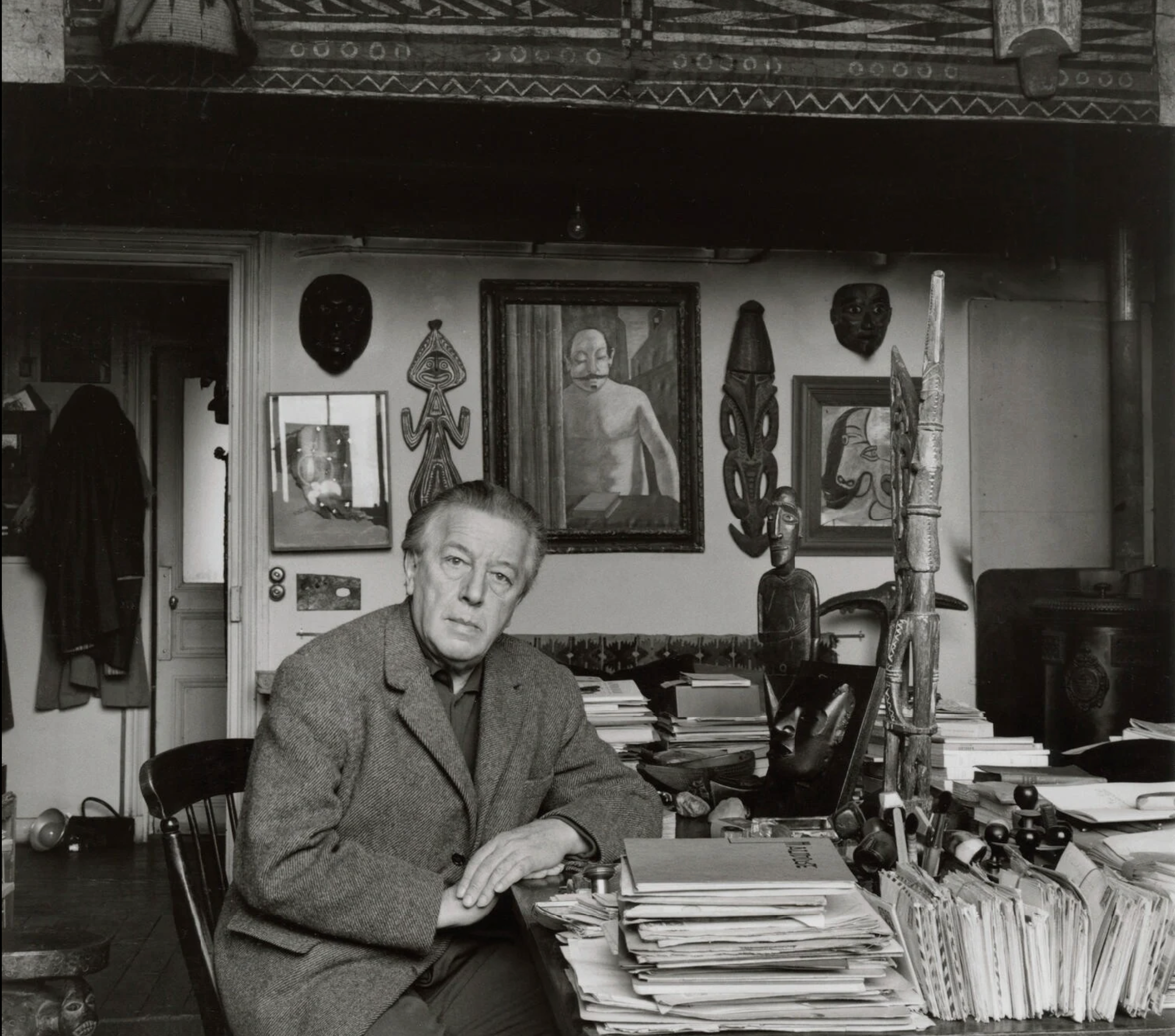 - A mounted Teotihuacan mask is placed on the desk facing Breton.