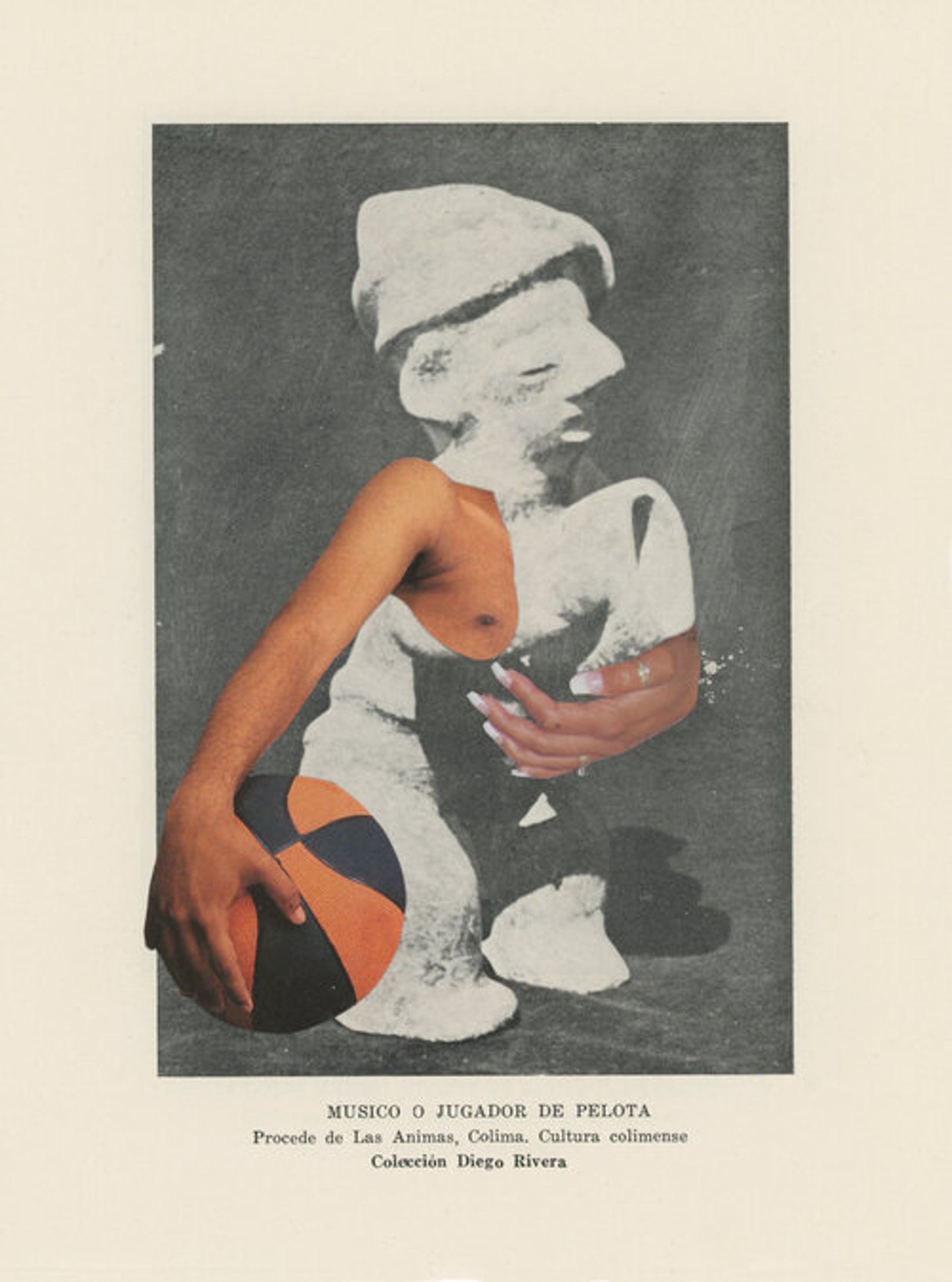 "Musico o Jugador de Pelota" illustrates another interesting set of tensions. In the foreground of the composition, we have materials gathered from two separate magazines, the first of which features a disembodied bare chest of a masculine figure whose arm reaches down to cup the basketball poking slightly out of frame (Figure 4). On the right, we have a bejeweled hand adorned with French tips nearly grazing the bare chest and applying pressure to the abdomen as the mouth of the figure opens as if ready to begin belting a tune. Baeza's source material correlates humorously to the vague title, "musician or ball player," assigned to the photograph of this ceramic, invoking a scene of collections managers or registrars scrambling to reattribute the identity of this figure after its removal from context. Items such as the Colima ceramics that make their way to prop houses, museums, and private collections could be referred to as refugees, in the legacy of Arjun Appadurai. Taking the social life of objects into consideration, his seminal essay “Museum Objects as Accidental Refugees” points out, “in the case of ethnological objects, which end up in Western museums, these object biographies and social lives are tied up with complex histories in which empire, science, the market and Western popular curiosity all play some significant role.”9 Baeza's appropriation of this title directly relates to its social life. Though made placeless, torn between designations, its reanimation through collage suggests new potential in forced collaborations. Flesh-toned arms newly attached, this figure can now be both the ball player, and the musician.