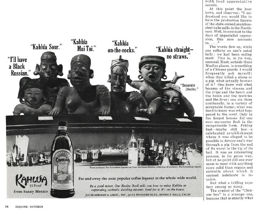 Fig. 2 – Kahlúa advertisement, Esquire vol. 66, no. 4 (Oct. 1966): p. 74. [Link to source]