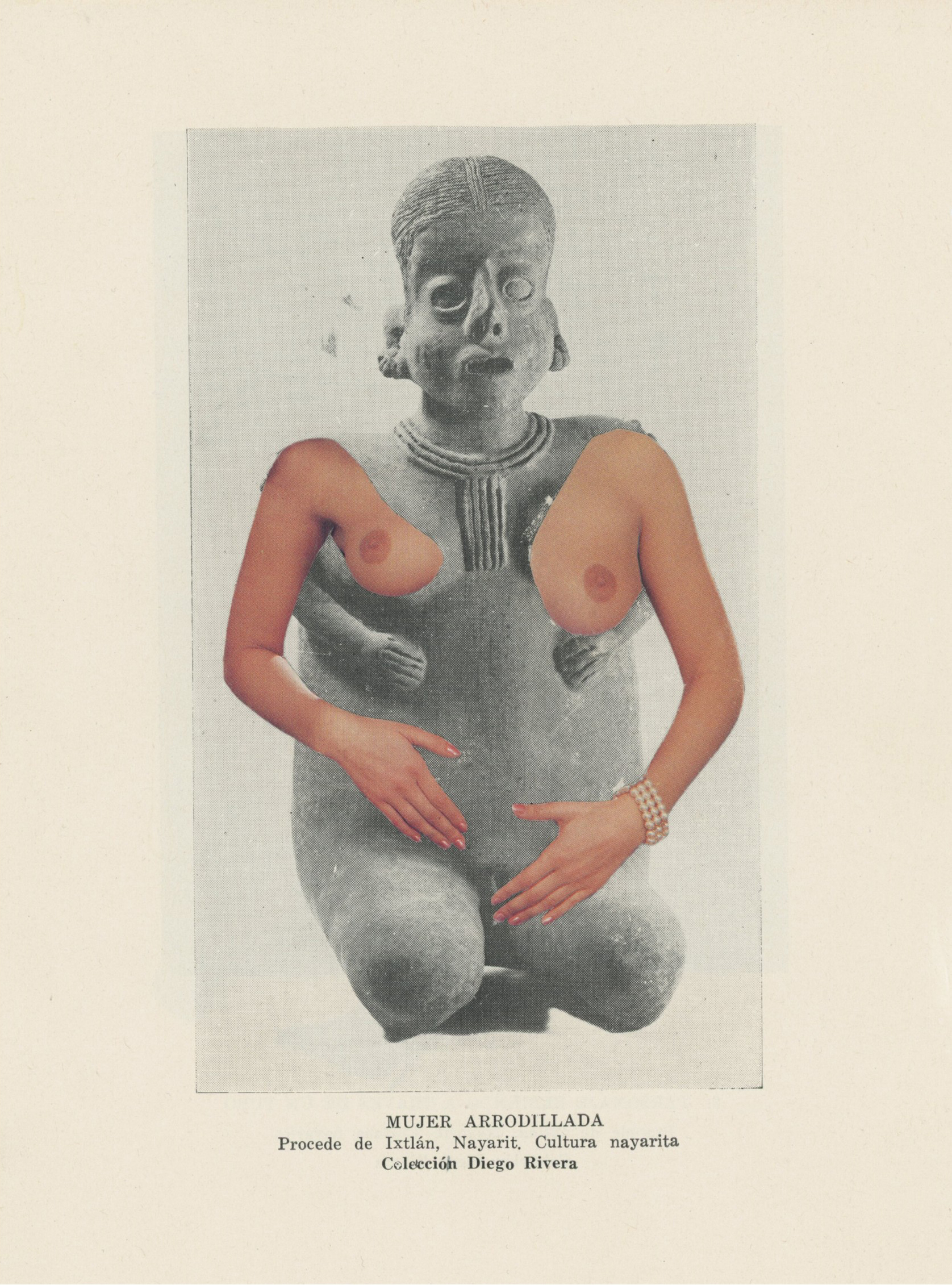 Before she was flattened through the photographic process, The "Mujer Arrodillada" was a polychrome ceramic figure from Ixtlán del Río in the modern-day Mexican state of Nayarit (300 BCE–300 CE), where she was found in the burial chamber of a shaft tomb. She was placed around generations of ancestors along with other funerary finery such as precious stone, amate paper, and other ceramic wares. Her neck and bare chest are adorned with a “y” shaped necklace that leads down to her hands tucked beneath her breasts. The shell-shaped earrings dangling from her lobes signify the bounty of the sea from which the people who inhabited this coastal region sustained themselves for millennia. After being removed from her original context and purpose, she was sold to none other than Diego Rivera, artist and intellectual aligned with an Indigenous construction of nationalism undertaken by the Mexican government in the 20th century.1 The same entity would financially back the book she was torn out of to make one of the collages in Felipe Baeza’s 2017 Gente del Occidente de México series (Figure 1).
